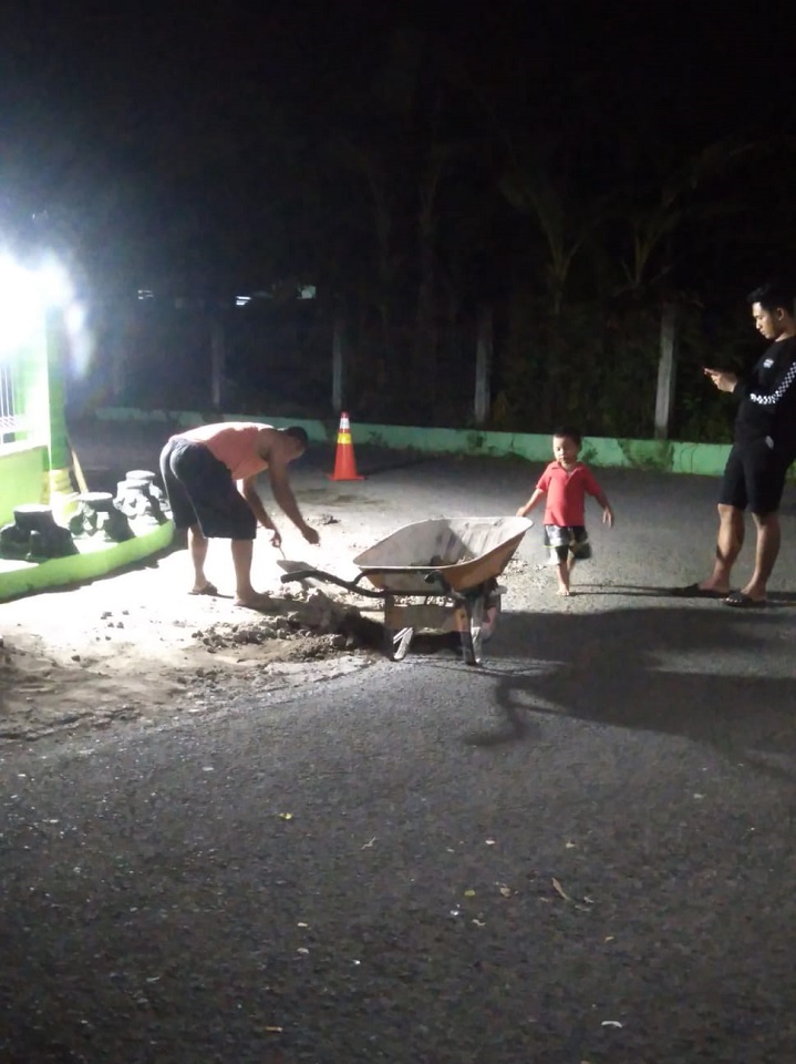 Suasana kerja bakti berlangsung dengan penuh semangat gotong royong dan kebersamaan. Meskipun kegiatan dilaksanakan pada malam hari, antusiasme warga tetap tinggi. Para bapak-bapak dan pemuda saling bahu-membahu, bekerja dengan kompak, serta saling membantu dalam setiap proses pekerjaan. Berkat kerja sama yang baik, kegiatan perbaikan jalan dapat berjalan dengan tertib dan lancar.