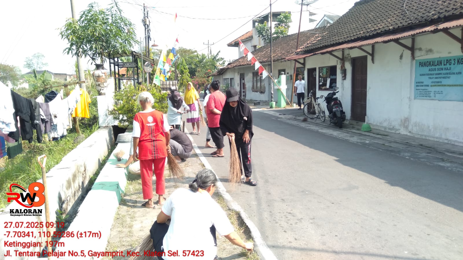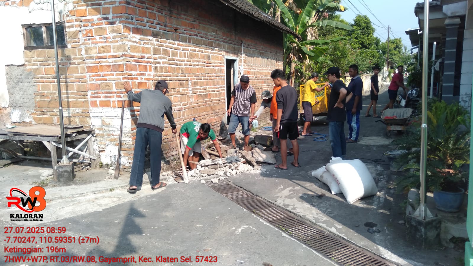 Kaloran, Gayamprit — Dalam semangat menyambut Hari Ulang Tahun (HUT) ke-80 Republik Indonesia, warga RW 08 Kaloran, Kelurahan Gayamprit, Kecamatan Klaten Selatan, menunjukkan semangat kebersamaan dengan melakukan gotong royong perbaikan jalan berlubang di wilayah RT 03. Kegiatan ini dilaksanakan pada hari Minggu, 27 Juli 2025, sejak pagi hari dengan melibatkan seluruh elemen masyarakat — dari bapak-bapak, ibu-ibu, hingga para pemuda Karang Taruna.