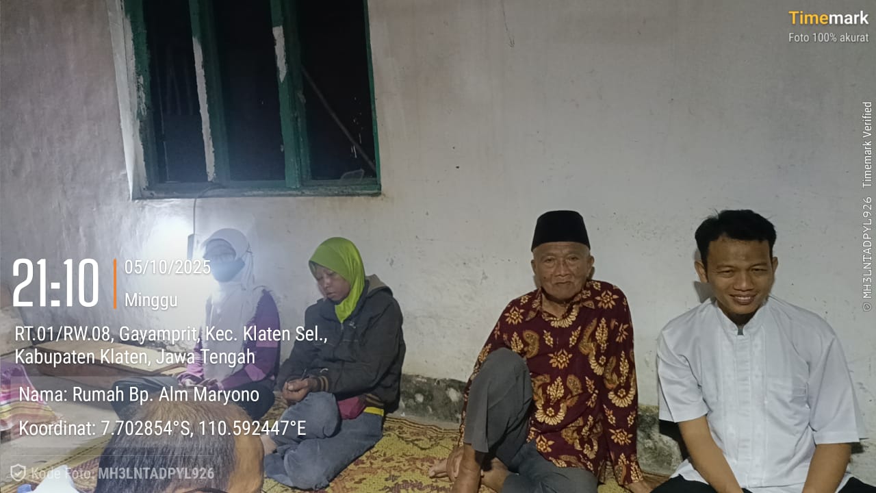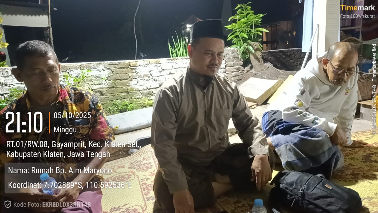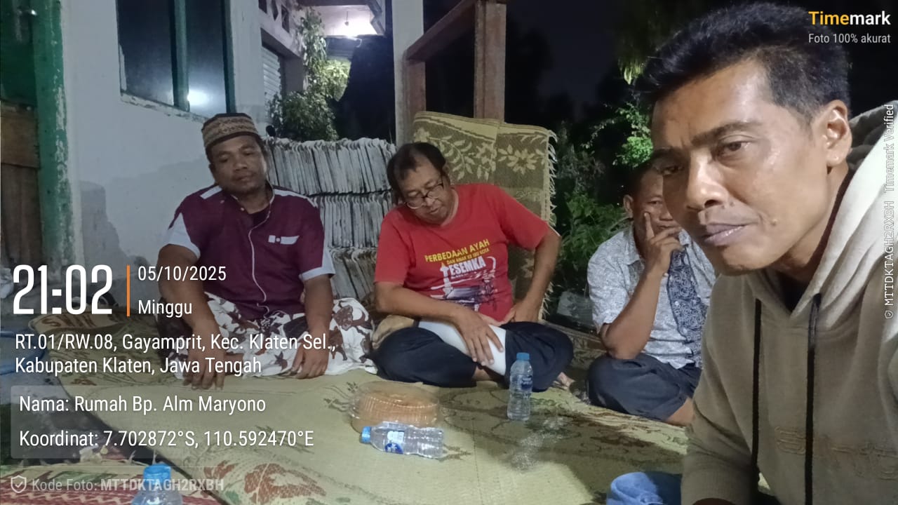 Keluarga almarhum Bapak Maryono melaksanakan musyawarah pembagian tanah dan rumah warisan yang berlokasi di Kaloran RT 01 RW 08, Kelurahan Gayamprit, Kecamatan Klaten Selatan. Acara ini dihadiri oleh keempat ahli waris, yakni Ibu Sri Indarti, Ibu Sumarni, Ibu Maryani, dan Bapak Haryana, dengan disaksikan oleh pengurus RW 08, para Ketua RT 01 sampai RT 03, serta perwakilan tokoh masyarakat setempat.